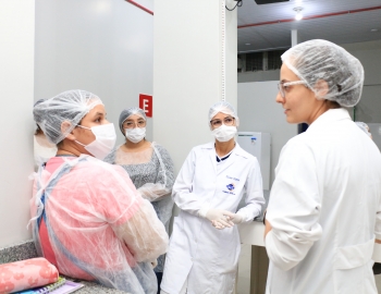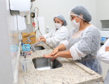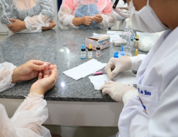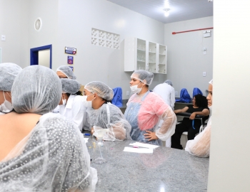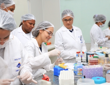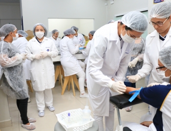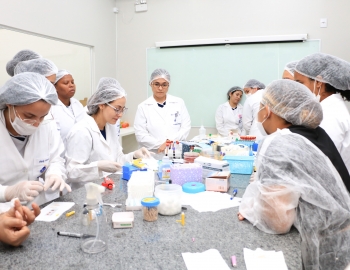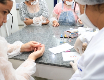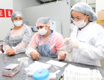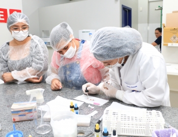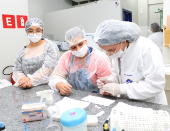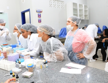 Os visitantes aprenderam técnicas apropriadas para aula de laboratório, como paramentação e lavagem de mãos corretos, além de técnicas de coleta de sangue e tipagem sanguínea e uma experiencia com os microscópios.