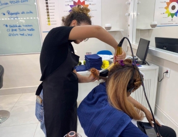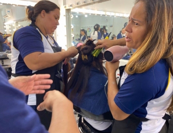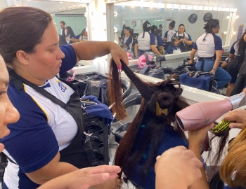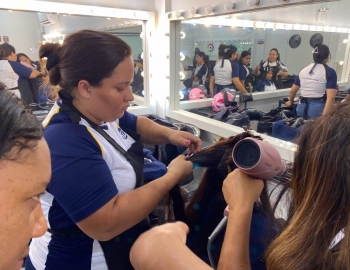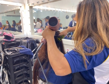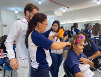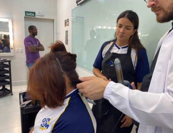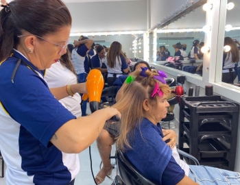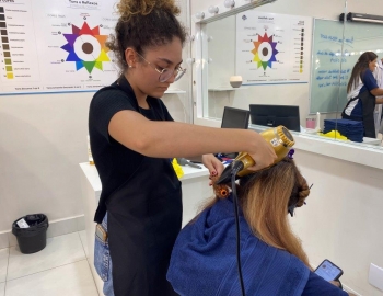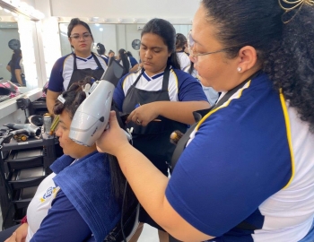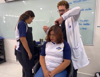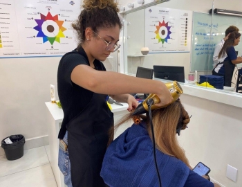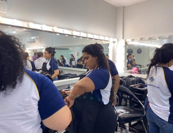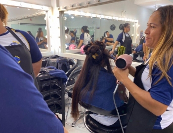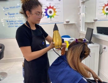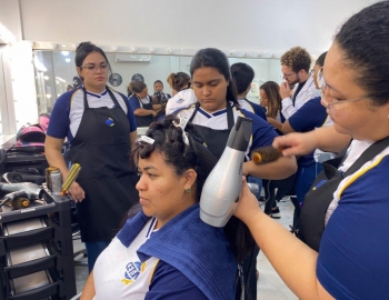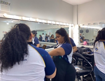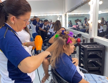 A nova turma do curso de Cabeleireiro Profissional em aula prática de técnica de escovas orientados pelo professor Victor.