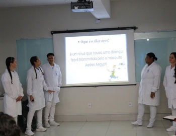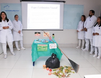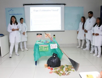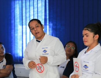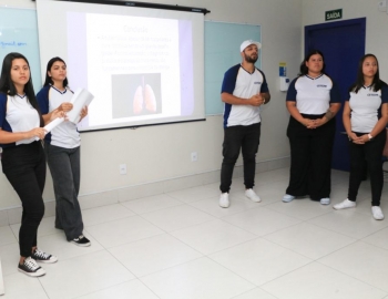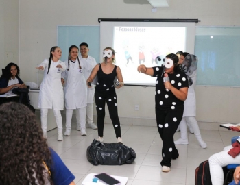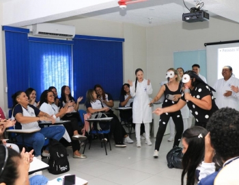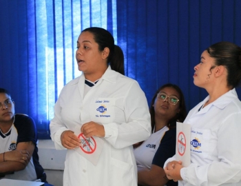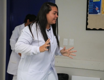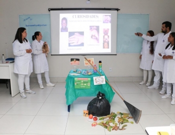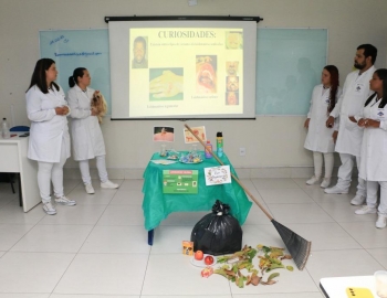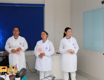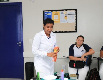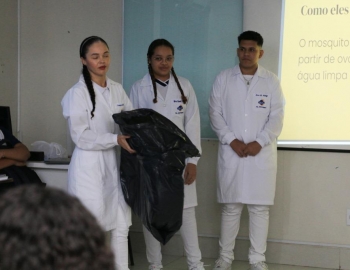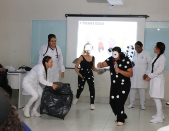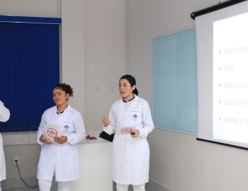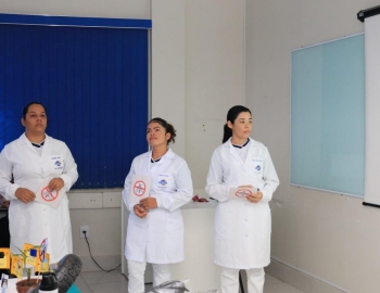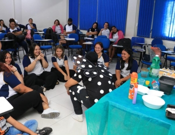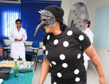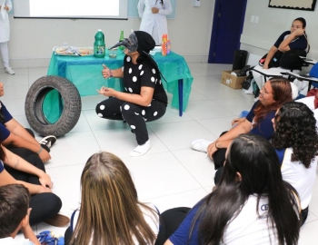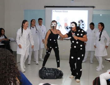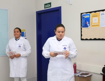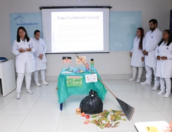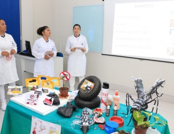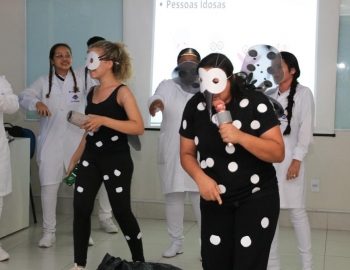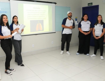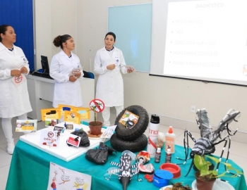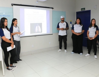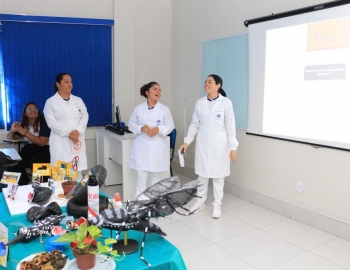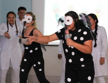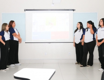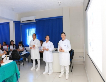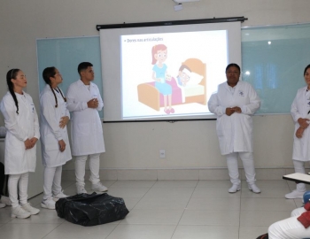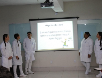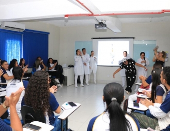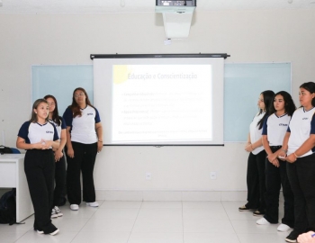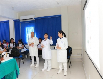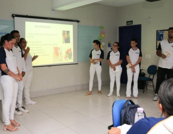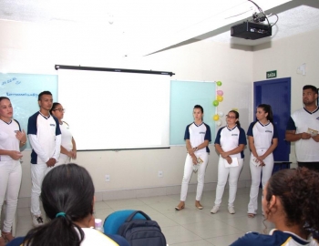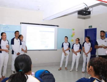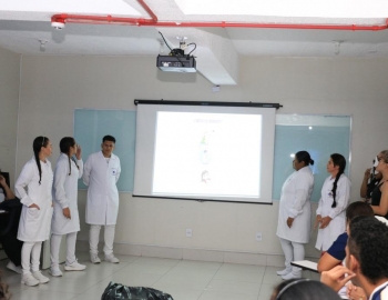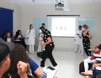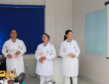 A turma 156 do curso Técnico em Enfermagem em apresentação do Seminário Projeto de Educação em Saúde. Sob a orientação da professora Rosemara, os alunos abordando diversos temas relacionados aos cuidados e prevenção de maneira dinâmica e descontraída.