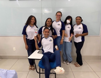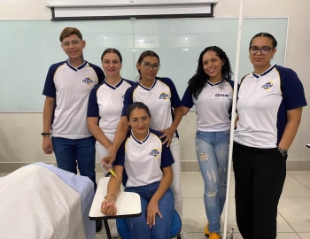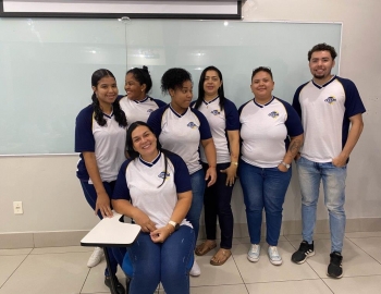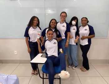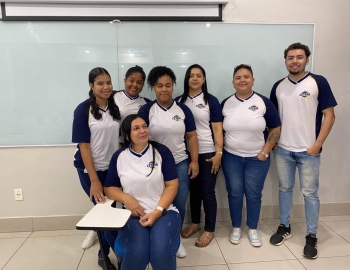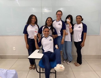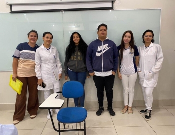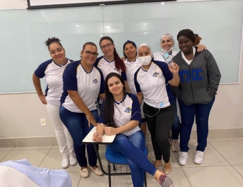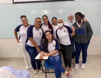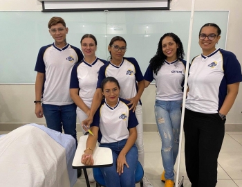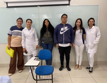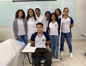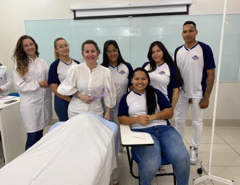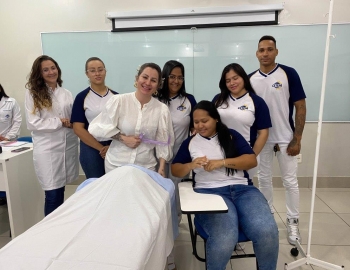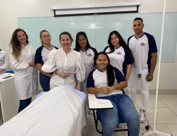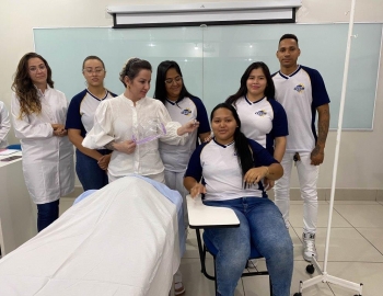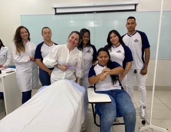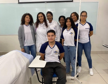 A turma 159 do curso Técnico em Enfermagem em simulação realística: cenas de atendimento sobre urgência e emergência, abordando os temas como negligência, imprudência, imperícia, religiosidade, paciente privado de liberdade, postura e imagem pessoal e identidade sexual, orientados pela professora Bruna.