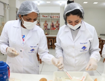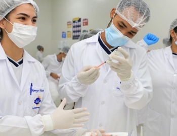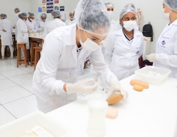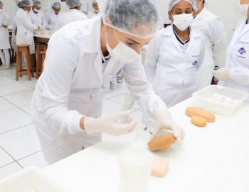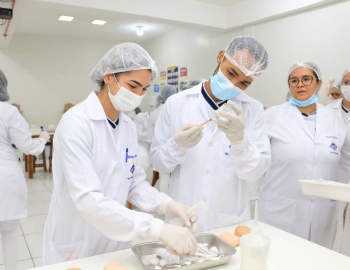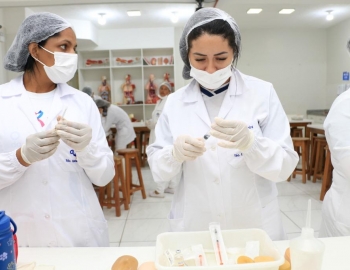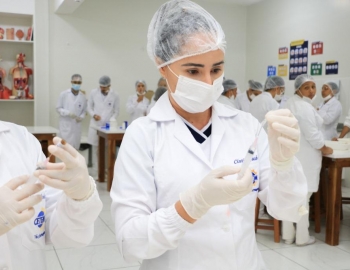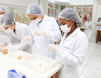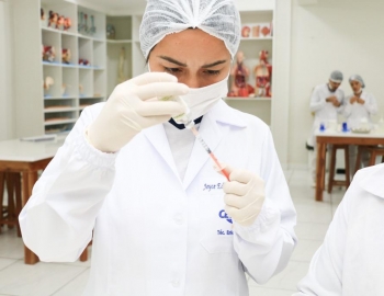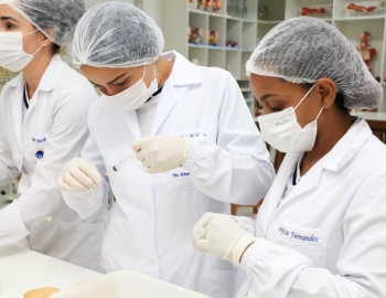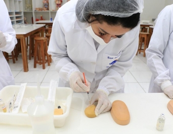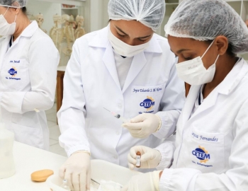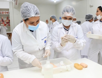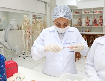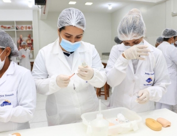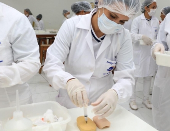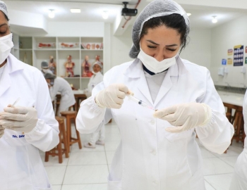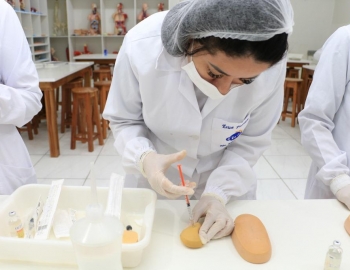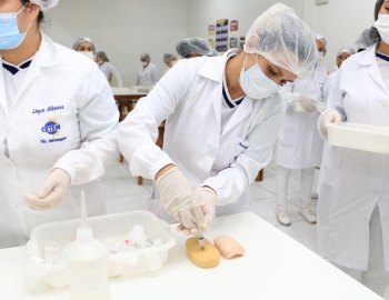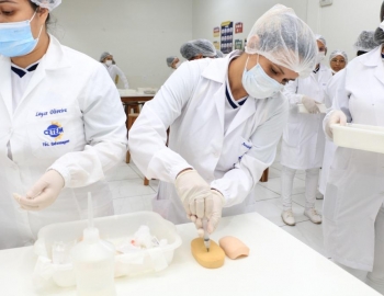 A turma 322/323D do curo Técnico em Enfermagem em aula prática do bloco Saúde da Criança, com técnicas de aplicação intramuscular e subcutânea.