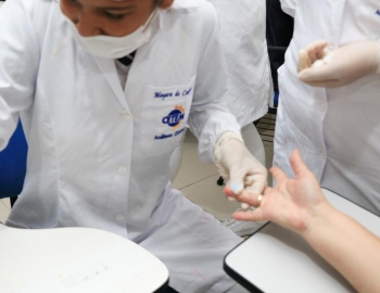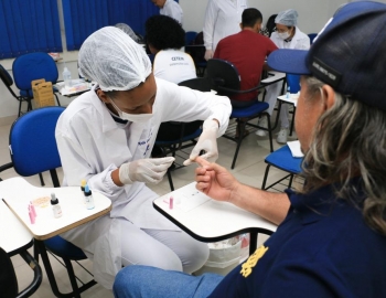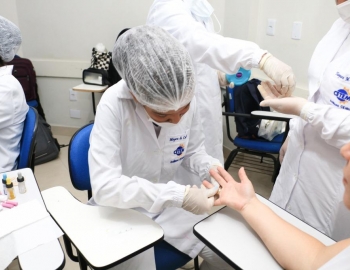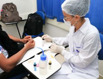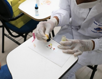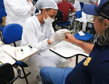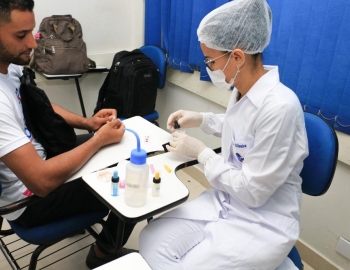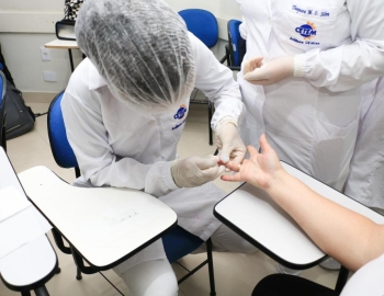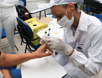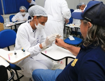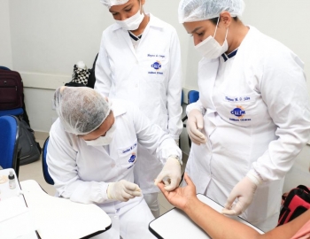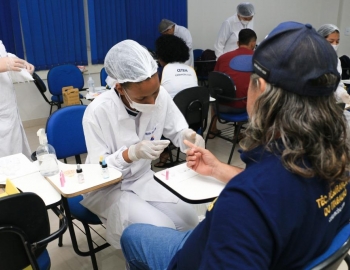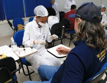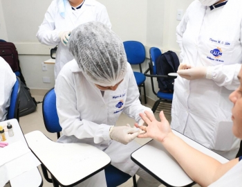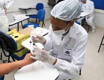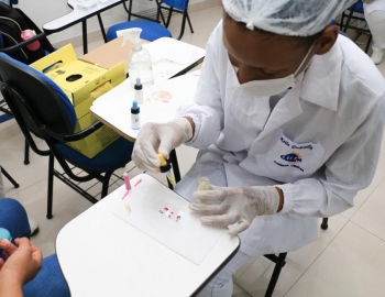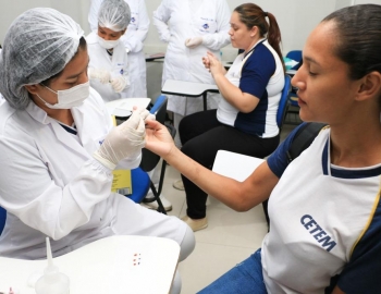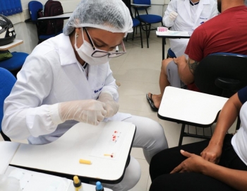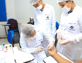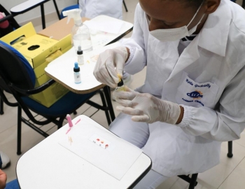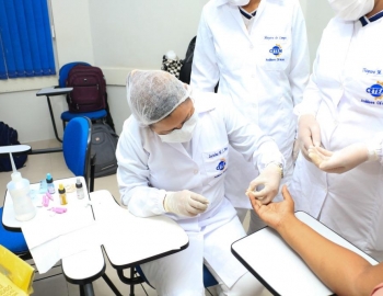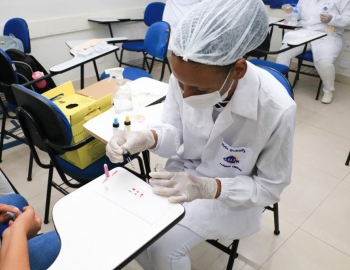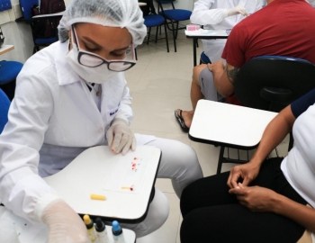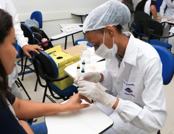 Turma 324L do curso Técnico em Análises Clínicas em ação de tipagem sanguínea com alunos de todos os curso do CETEM.