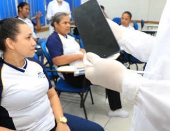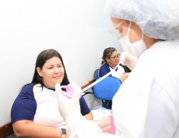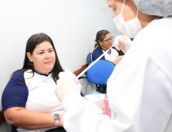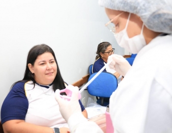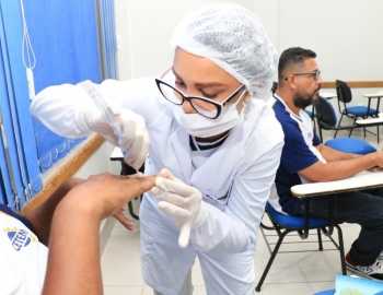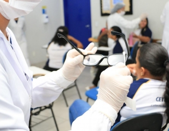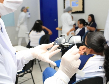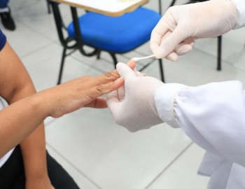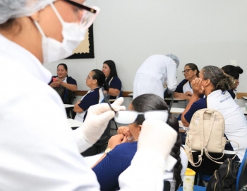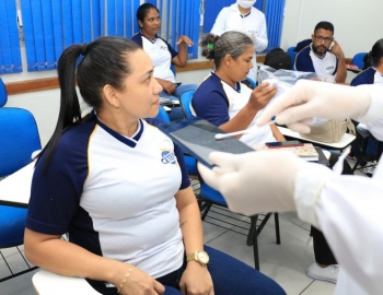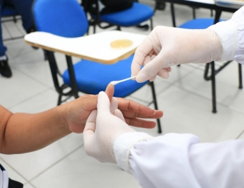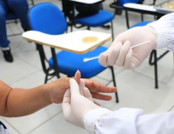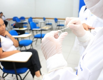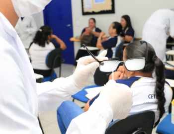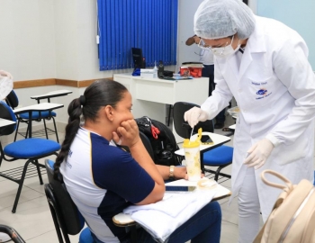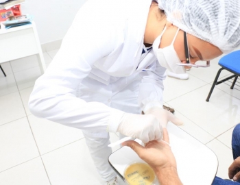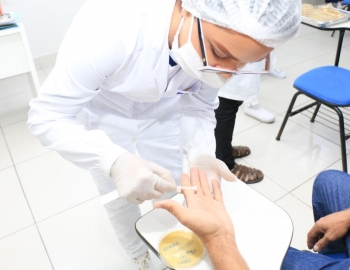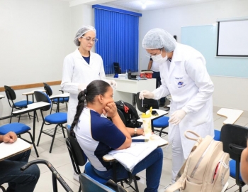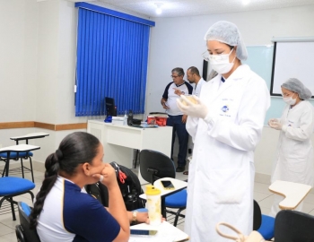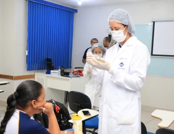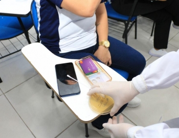 Turma 324L do curso Técnico em Análises Clínicas em pesquisa de microrganismo com objetos pessoais dos alunos do curso Técnico em Cuidados de Idosos, orientados pela professora Raquel.