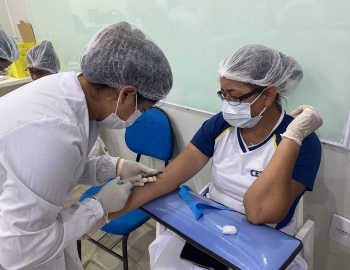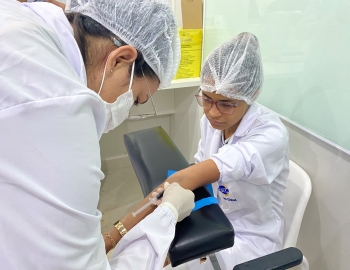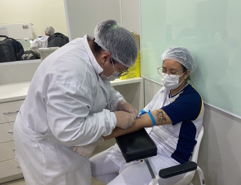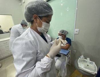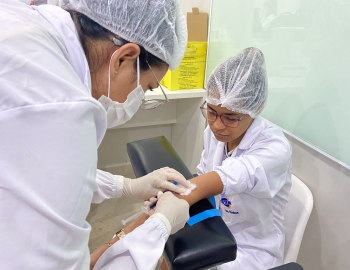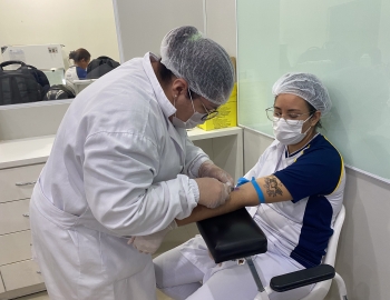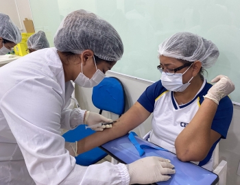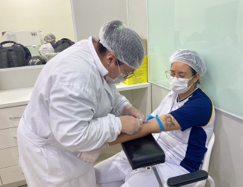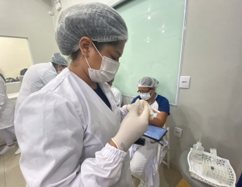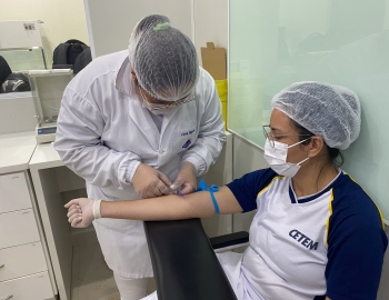 Turma 324L do curso Técnico em Análises Clínicas em aula prática de coleta sanguínea, orientados pela professora Raquel.