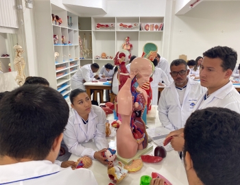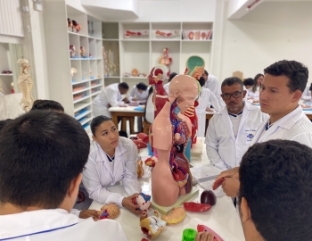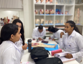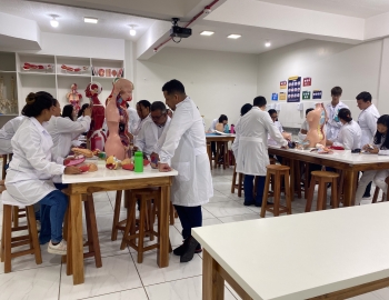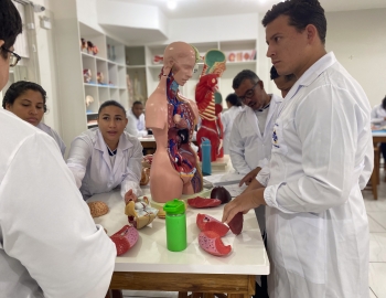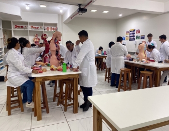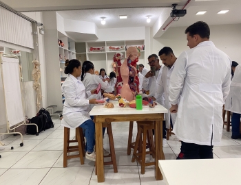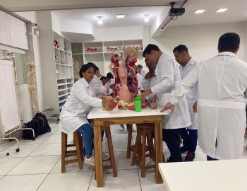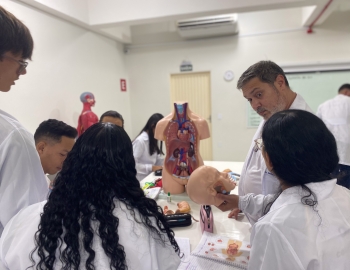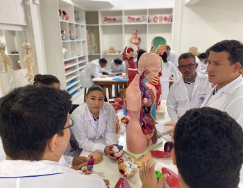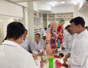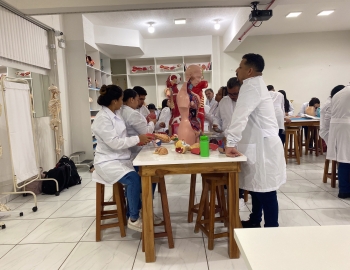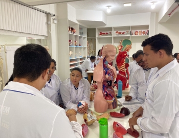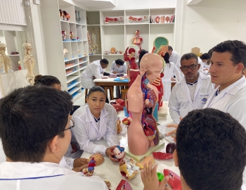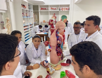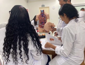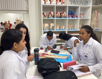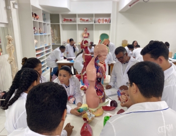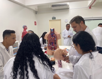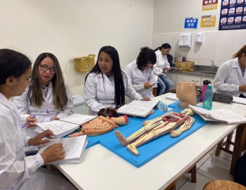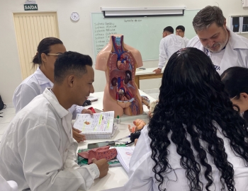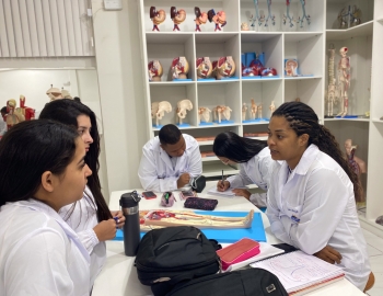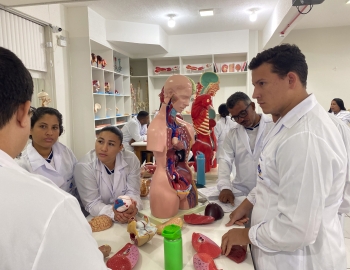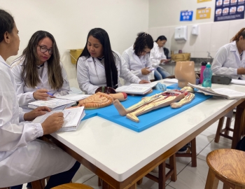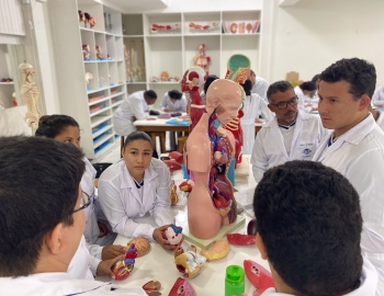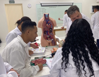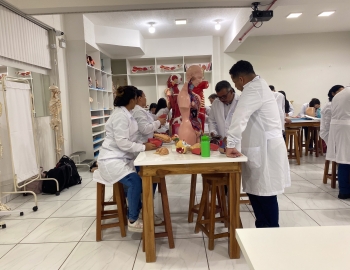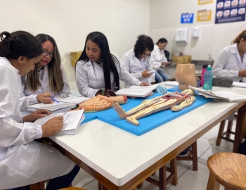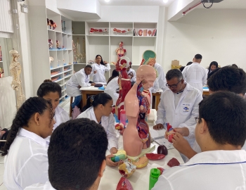 Turma 327R do curso Técnico em Radiologia em aula prática de anatomia e fisiologia humana orientados pela professor Miguel. As práticas são necessárias e importante para que o estudante possa aprimorar seu conhecimento e sentir segurança quando entrar para o mercado de trabalho.