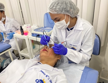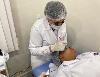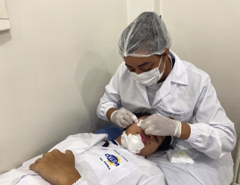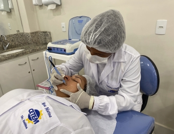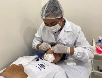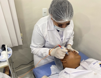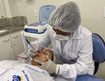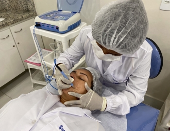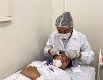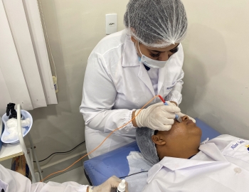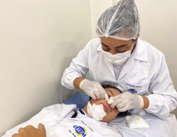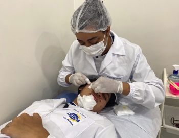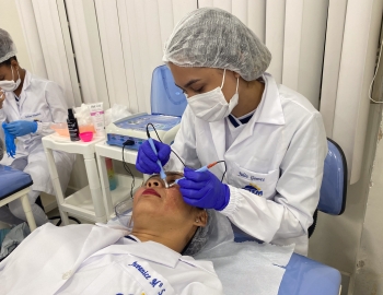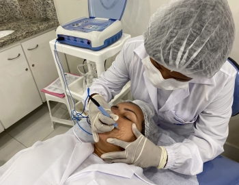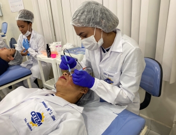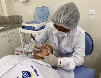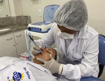 Turma 607/608 do curso Técnico em Estética em estágio supervisionado no Centro Estético CETEM, realizando procedimentos faciais, orientados pela professora Cemisa.