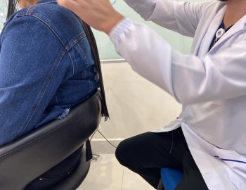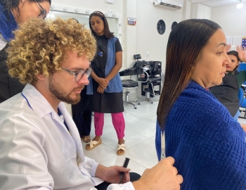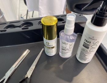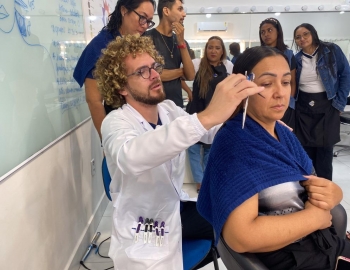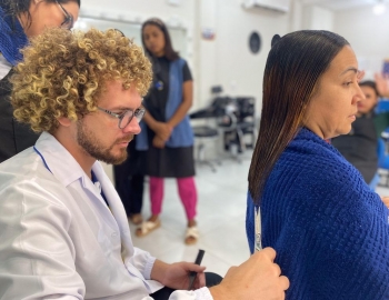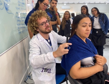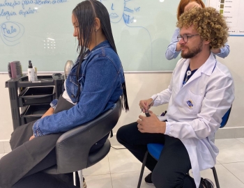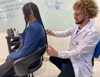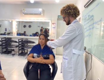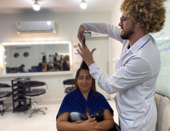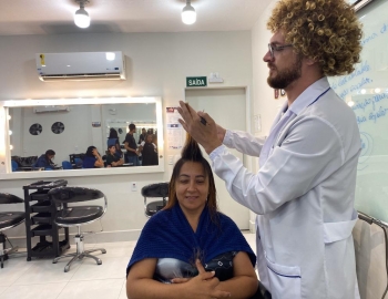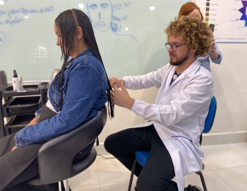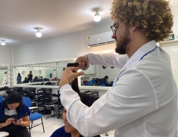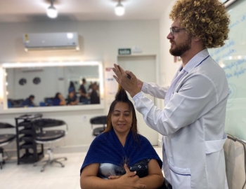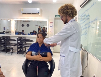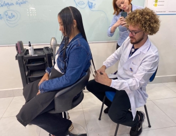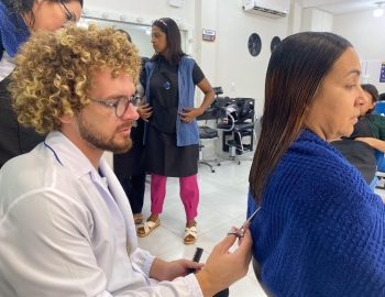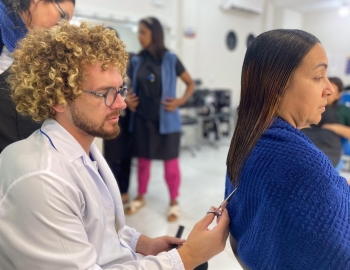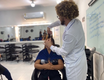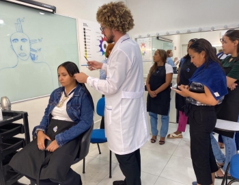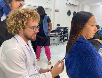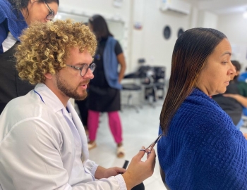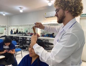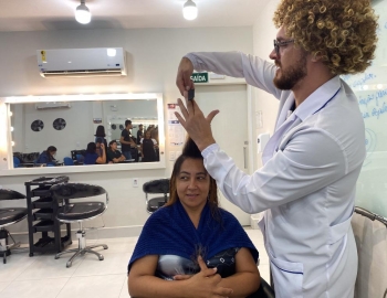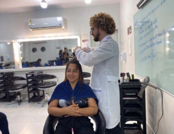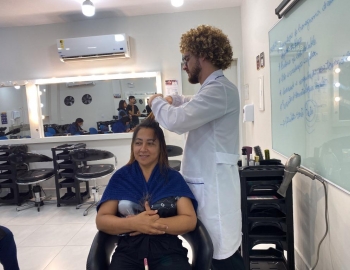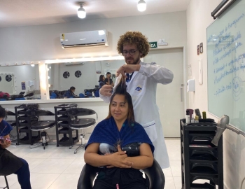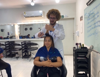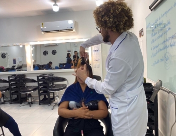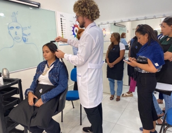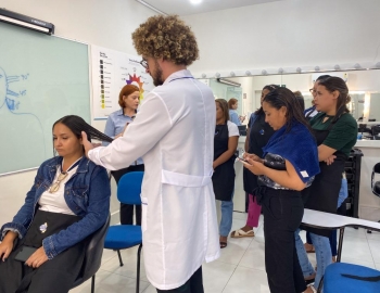 A turma do curso de capacitação em cabeleireiro profissional em aula de técnica de corte simples com professor Victor Galdino. As práticas são necessárias e importante para que o estudante possa aprimorar seu conhecimento e sentir segurança quando entrar para o mercado de trabalho.